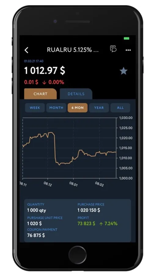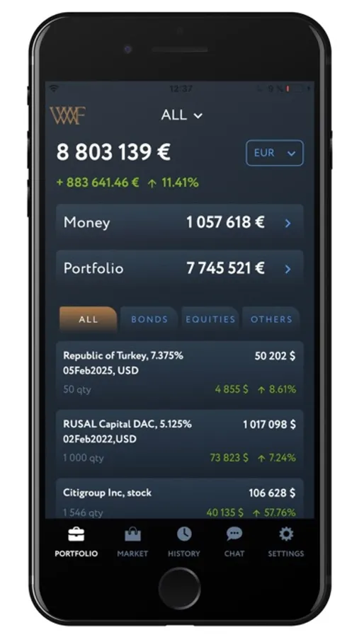 - Relevant information about the portfolio in real time. Balance and current profitability of accounts, profitability in the portfolio (purchase price, profitability, present value) and historical data in any currency