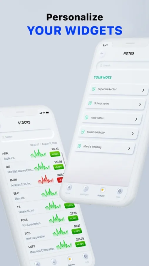 - Customize widget content with multiple features: Stocks, Notes and Weather, Clock, Calendar, News, Reminders (upcoming)