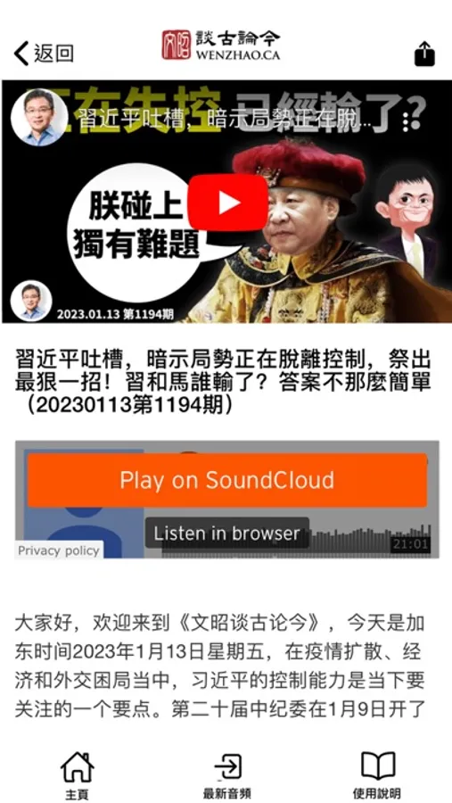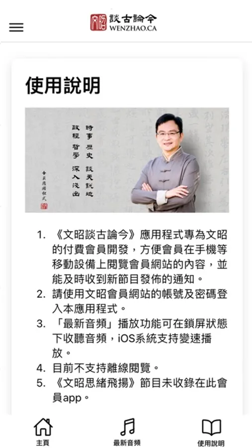 『文昭談古論今』APP方便在手機等移動設備上閱覽內容,支持在鎖屏狀態下收聽音頻,並能及時收到新節目發佈的通知。