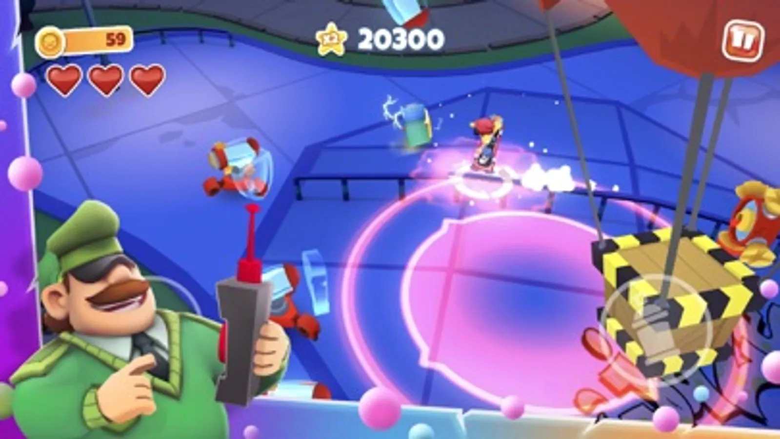 Chase your high score! Free skate across the arena, grinding rails, landing jumps, tagging objectives and blasting the clean up crew bots to gain sweet combo point action. Avoid Guard and his clean-up-crew as they chase you down to put an end to this foolishness.