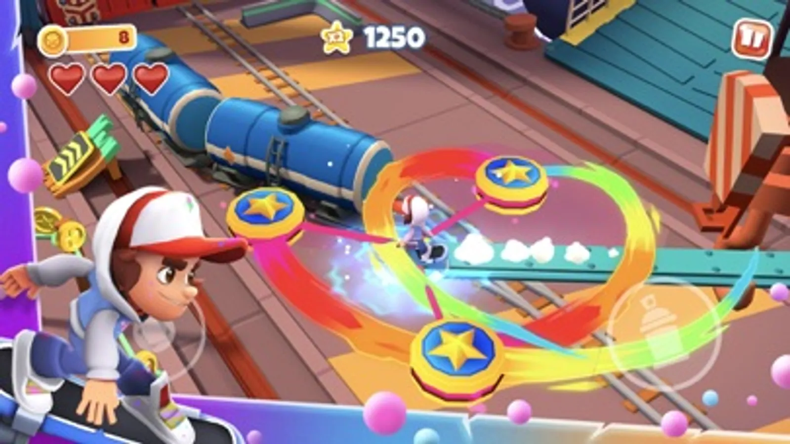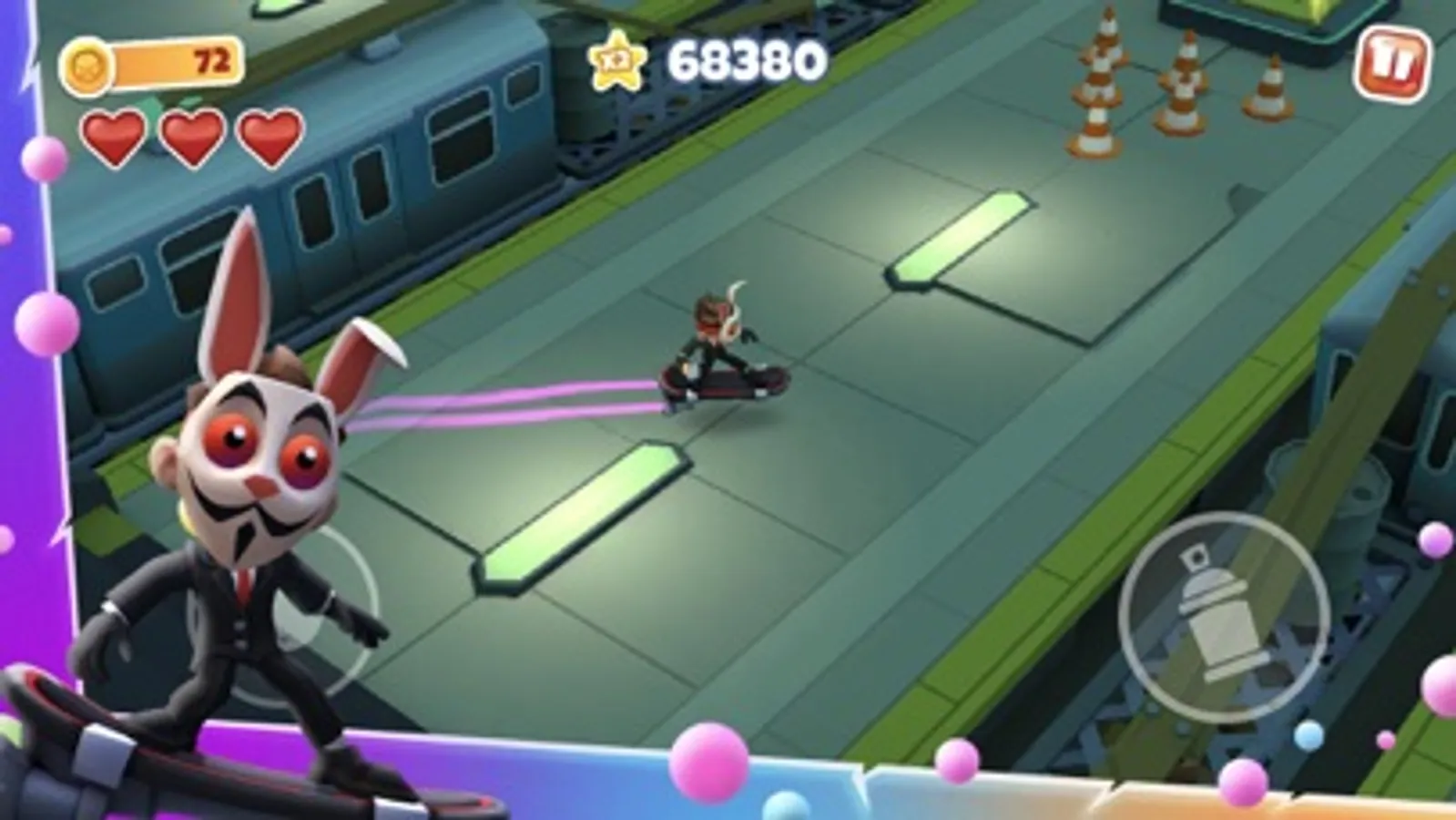 Pick up re-imagined Subway Surfers power-ups to increase your score multiplier, and set new high scores. Collect and spend star coins to use on upgrading your crew for all future runs. Complete mission sets to increase your score multiplier for future runs.