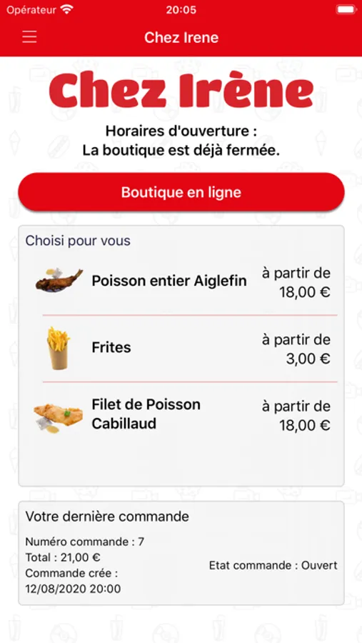 Avec votre application Chez Irène profitez de commander votre traditionnel POISSON frit Schueberfouer à partir du 22 août au 06 septembre inclus. Cette année vous trouvez la Friture Chez Irène à Bertrange sur le site du restaurant *Rackett*. Au plaisir de vous accueillir.