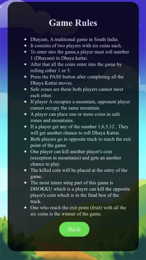 Players take turns rolling the Dayakattai. When a player rolls a Dayam (0 on one die and 1 on another), he moves one of his pieces one space, rolls again and advances his piece by the number indicated by the dice. The want to move all the pieces out of the home, Daayam must be rolled for each one.