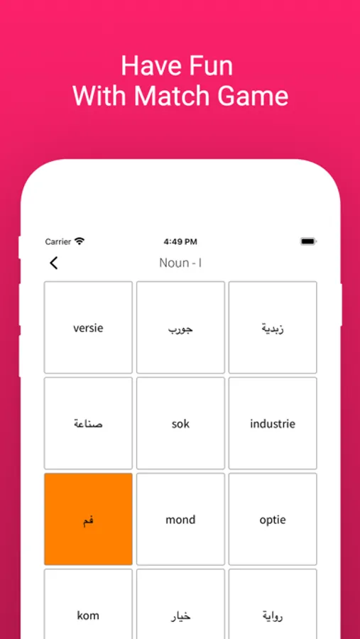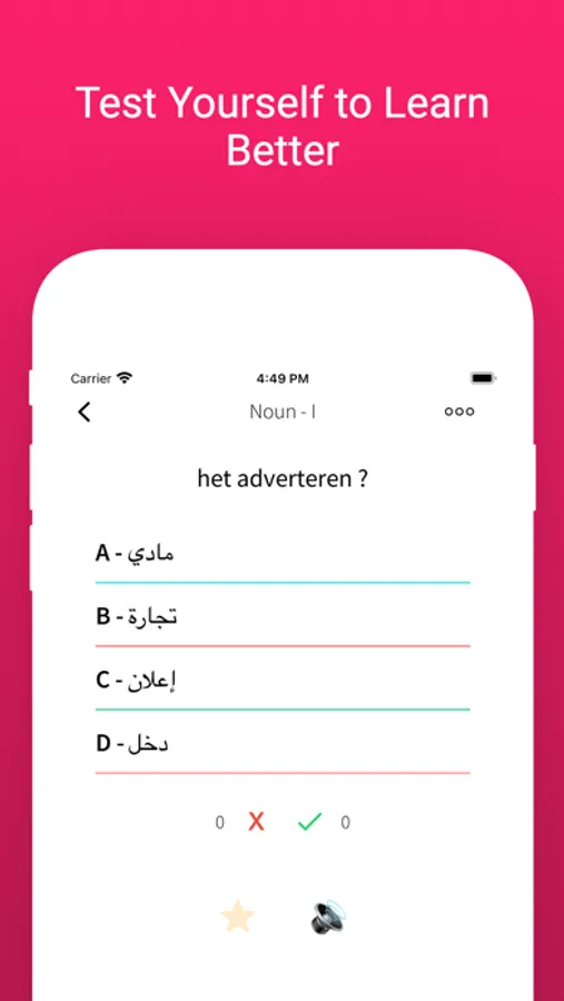 Vocabulary is important to speak and understand a language. You can memorize words with this app. From Dutch to Arabic. or Arabic to Dutch.