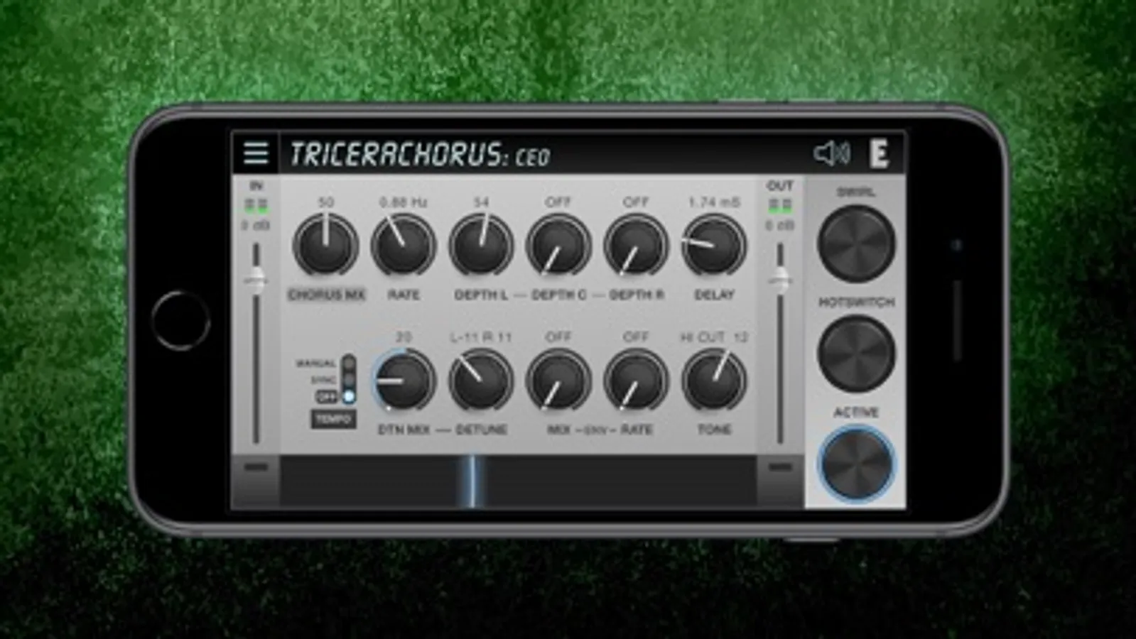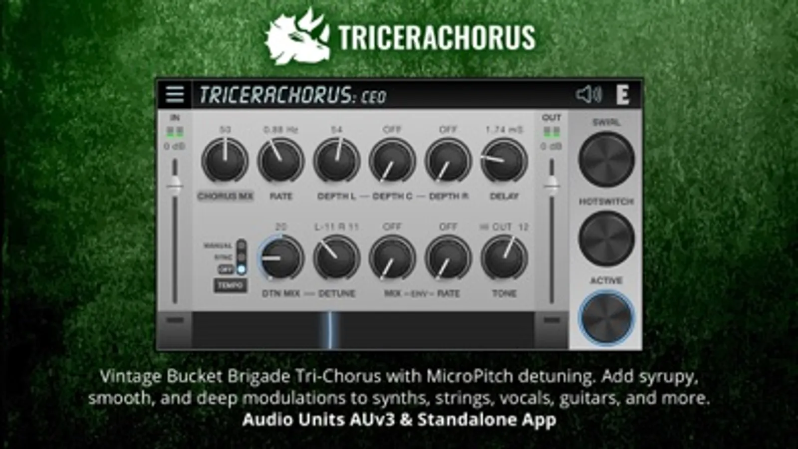 TriceraChorus is inspired by the classic tri-choruses and stompbox choruses of the 1970s and early 1980s. It pairs rich BBD style tri-chorusing with another classic effect of the 1980s: Eventide micro-pitch detuning. This effect can be used to thicken the sound, to add static chorusing, and to spread the stereo field by detuning the left and right signals in opposite directions. Combine these tools to create syrupy, smooth, and deep modulations on anything from flat synths and strings, to dry vocals, guitars, and more. The TriceraChorus effect was designed to inspire experimentation with a UI optimized for live performance. Whether on your iPad or iPhone, TriceraChorus will expand your sonic pallet.