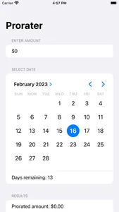 Application to calculate the prorated amount at any given day of a month based on a monthly fee or charge.