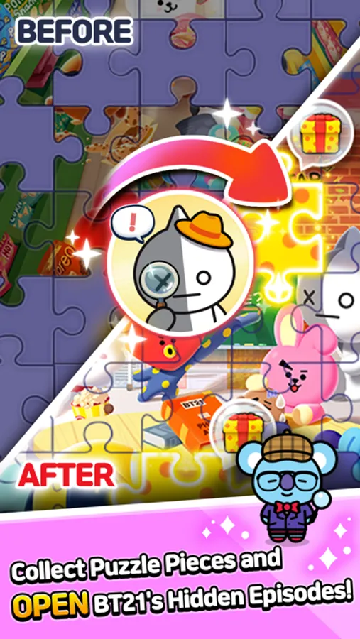 Join BT21 characters to solve the puzzles, gather happy memories and complete the album!