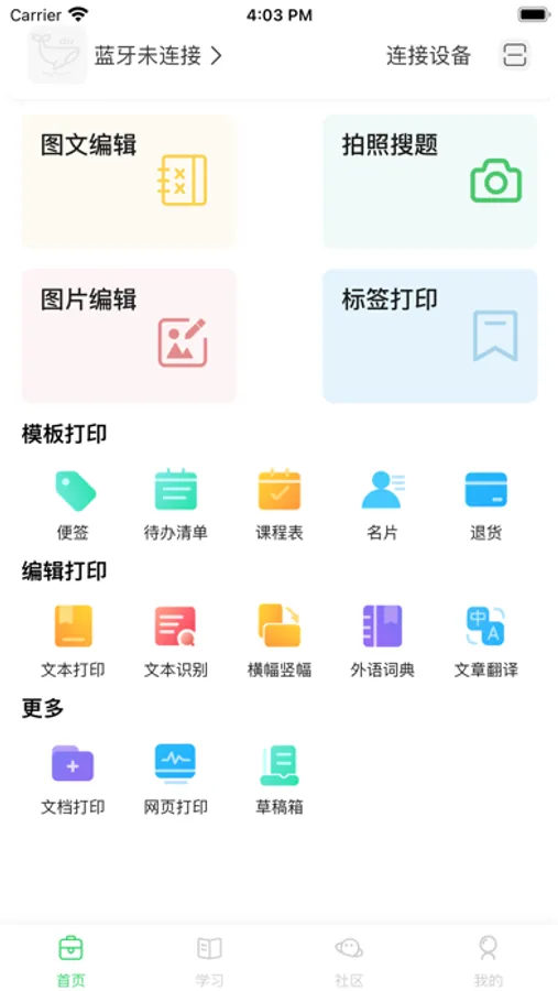 便携热敏打印机,用蓝牙连接打印机进行打印操作。 支持文本识别,图文混编,字体表情随心选,更可添加背景边框。 支持拍照搜题,文本,图片,文档,网页打印。