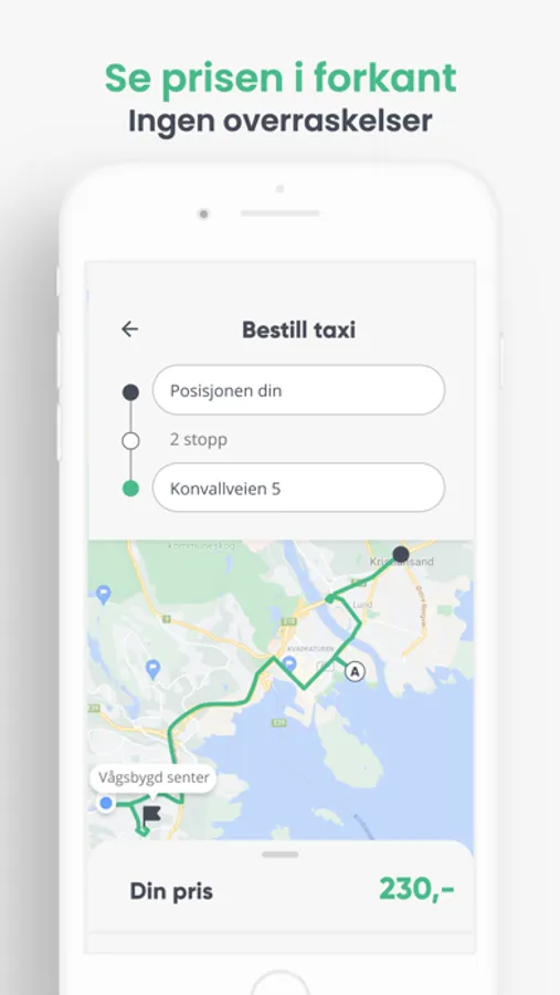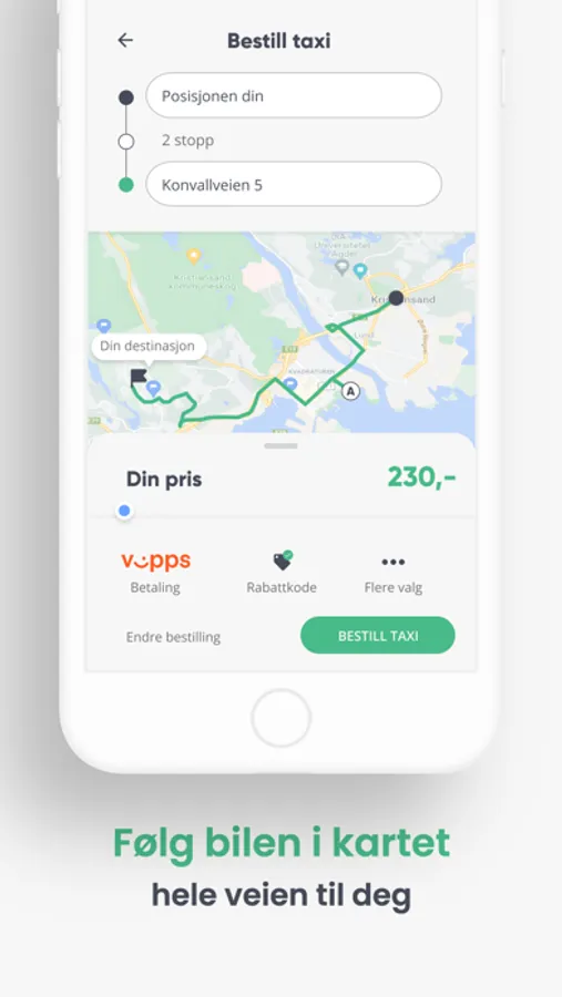 På kartet kan du følge bilens posisjon hele veien til der du befinner deg, og så videre hele veien til din destinasjon. Når du ankommer, trekkes beløpet automatisk fra ditt registrerte kort eller Vipps-konto og du får tilsendt din kvittering.