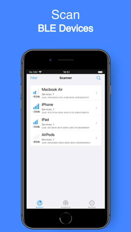 - Filter Scanned Peripherals by Name, Manufacturer, Services (Advertised & Connected), and RSSI Level