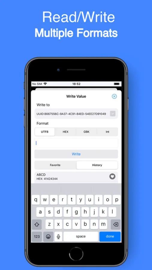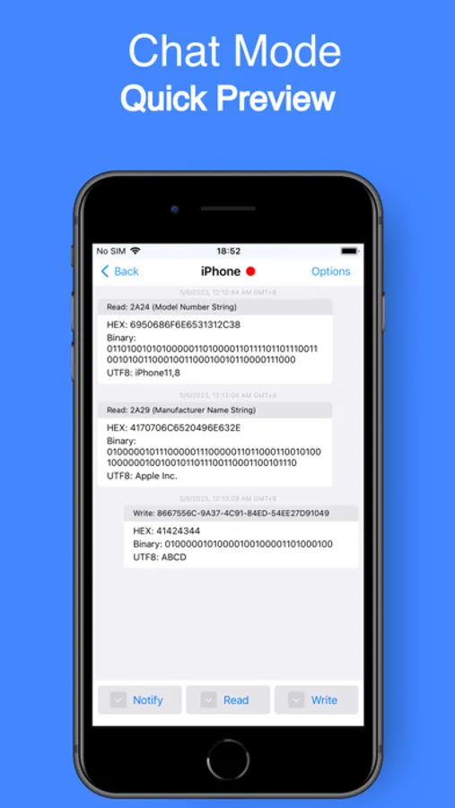 Full support for reading, writing, and notification is included. You can view the signal strength (RSSI) to get an idea of how close you are to the peripheral.