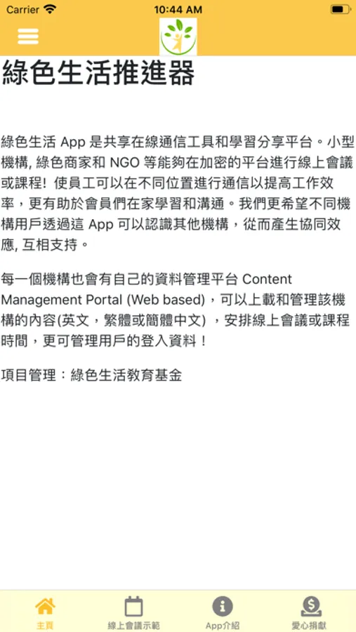 綠色生活 App 是共享在線通信工具和學習分享平台。小型機構、綠色商家和 NGO 等能夠在加密的平台進行線上會議或課程!使員工可以在不同位置進行通信以提高工作效率,更有助於會員們在家學習和溝通。我們更希望不同機構用戶透過這 App 可以認識其他機構,從而產生協同效應,互相支持。