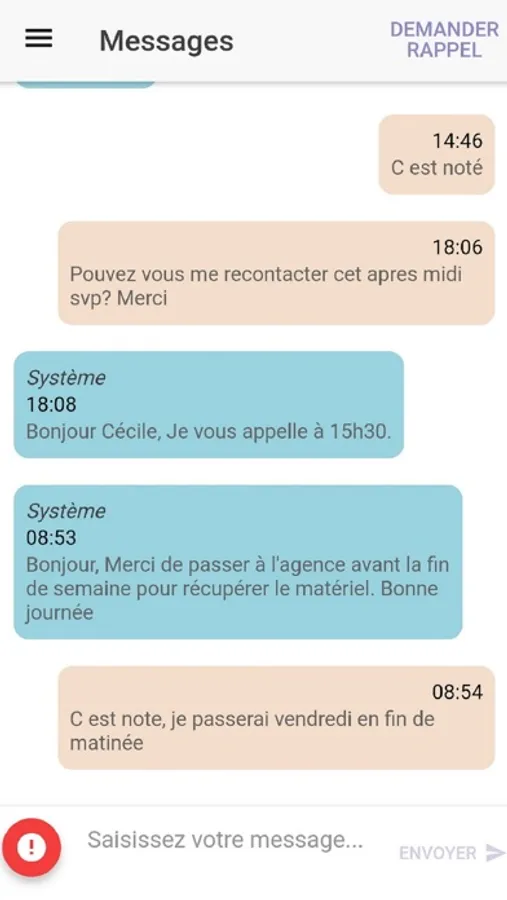 Il arrive fréquemment que les intervenants aient besoin de communiquer avec l'agence pendant ou même en dehors des interventions : empêchement, matériel cassé, évolution des besoins du client, etc.
