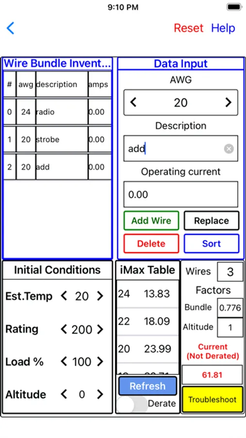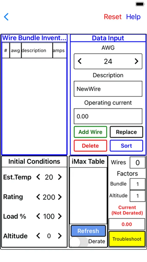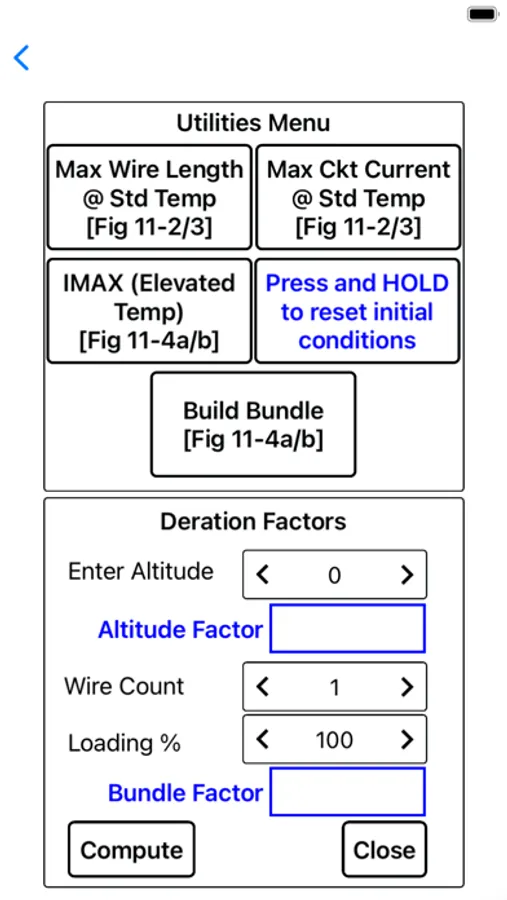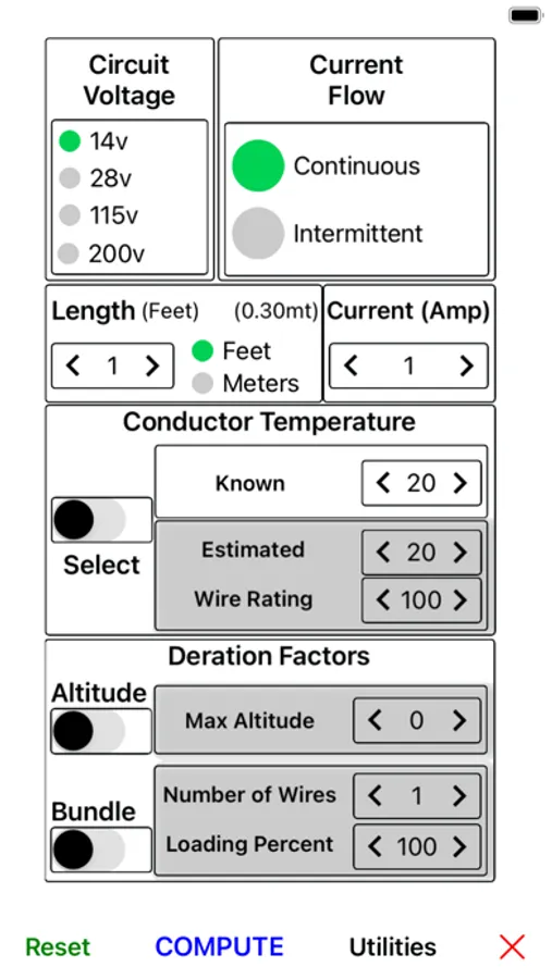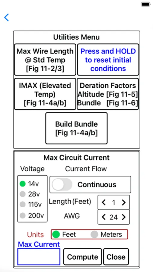 This app assists the aircraft airframe and powerplant (A&P) mechanic in determining the correct American Wire Gauge (AWG) wire size for given conditions, according to procedures outlined in FAA Publication AC 43-13 1B (Acceptable Methods, Techniques, and Practices - Aircraft Inspection and Repair), Chapter 11.