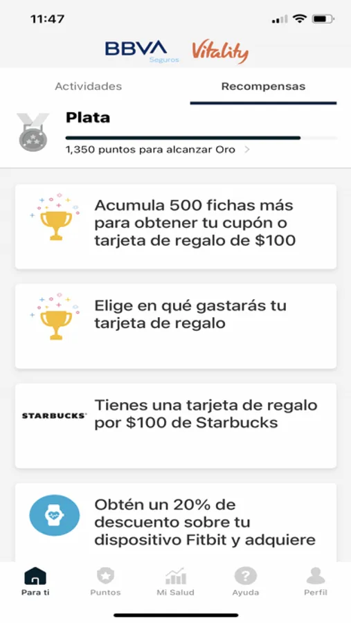 Vitality cuenta con funciones que te ayudarán a disfrutar un estilo de vida saludable. Por ejemplo, puedes recibir una gift card para canjearla por un café cuando alcances tus metas semanales. Además, puedes comprar un dispositivo Fitbit con tarifa preferencial.
