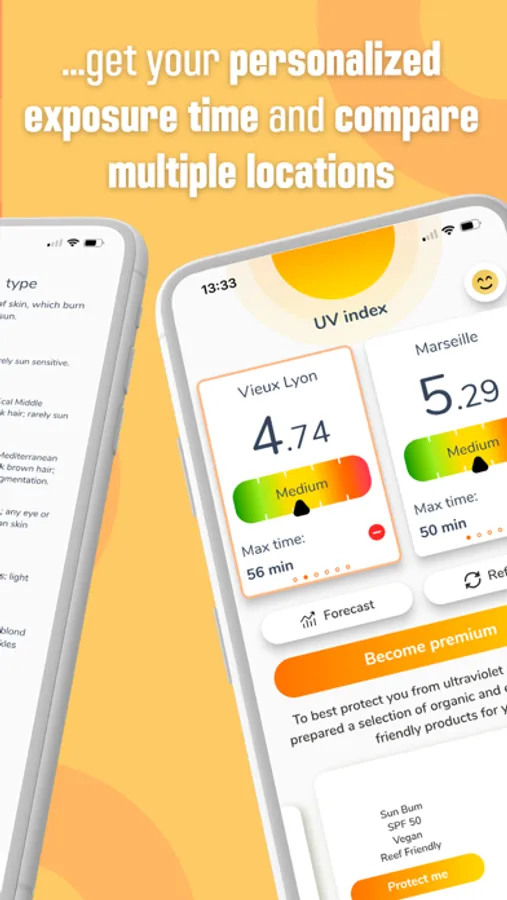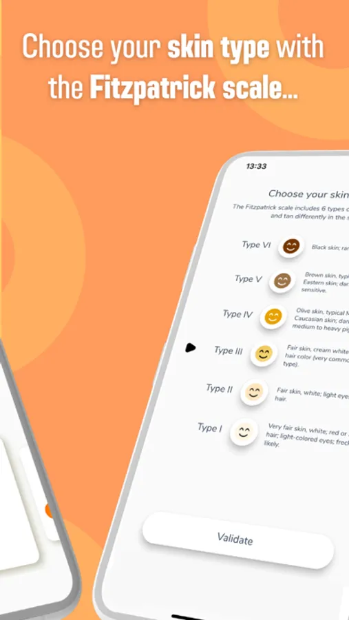 Based on the Fitzpatrick scale, which classifies individuals according to their skin's reaction to sun exposure, you can choose your skin type. You will then get personalized values for your maximum sun exposure before getting sunburned.