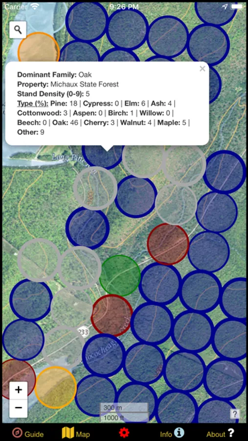 In addition to defining the link between trees and mushrooms, this app goes one step further. An inventory of millions of data points from forest stands across the state has been filtered and processed to clearly highlight specific areas that have the highest probability of yielding a harvest of mushrooms. These circular polygons are color-coded by species and attributed with useful information such as stand and species density, along with land unit name, so you can quickly differentiate between tree types in the map view and target the best areas to search.