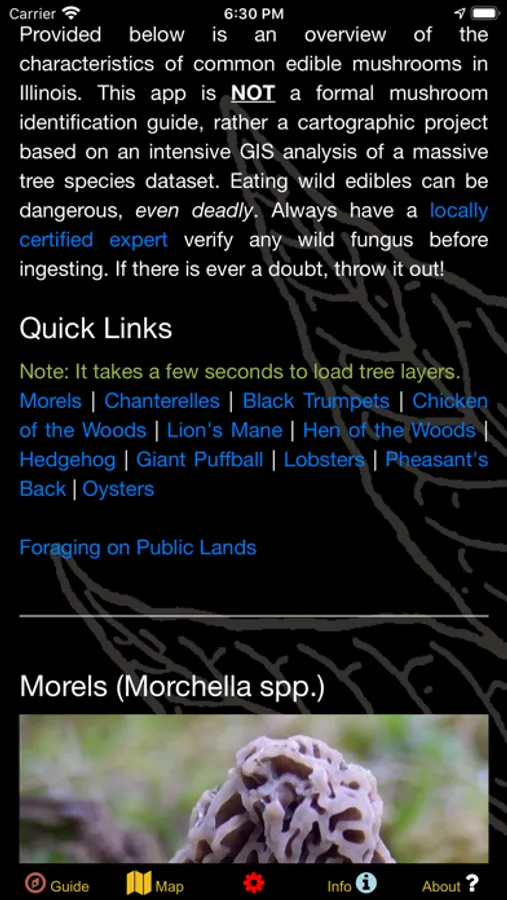 There is a wealth of useful information including descriptions of the different mushrooms and details on their characteristics. These sections even have buttons which will filter the map to show only tree species that are associated with a target mushroom! It is truly that easy...you want to find morels? Turn on the app, Show Morel Trees, and plot your GPS location to find the nearest forest stands where morels likely spawn.