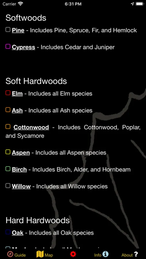 You can manually toggle given tree species on or off if you're an arborist specifically interested in forestry rather than mushrooms. This app is a great way to discover old forest stands or to learn how to identify certain types of trees by look. If you are interested in finding birch bark, oak acorns, apple trees, sugar maples, walnuts, or hickory nuts, just turn on a given layer and eliminate the guessing and frustration! Need some pine needles and cones for an art project? Pick from thousands of woodland patches laden with beds of them!