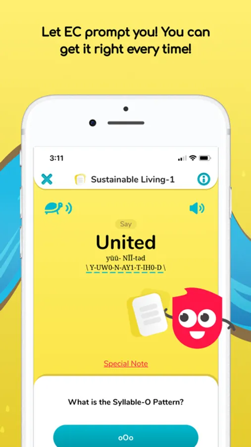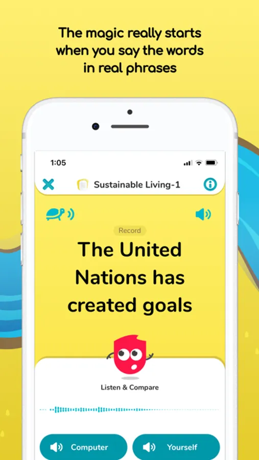 You start playing each game by recording a baseline phrase. Then you do the exercises on each word with the help of EC (pronounced EE-SEE). You end the game by recording yourself saying the baseline again. You will be amazed at your improvement!