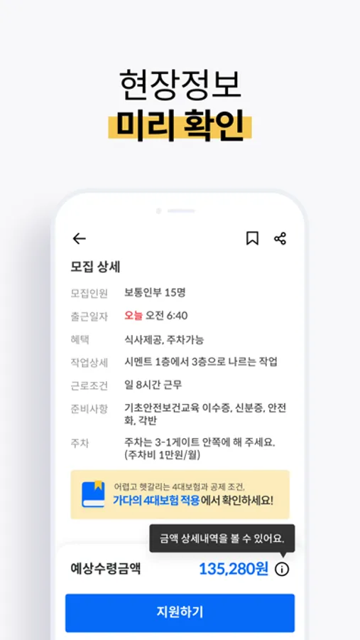 - 위치, 출근 일자, 시간, 실수령액을 모두 확인하고 빠른 지원을 누르시면 지원 완료!