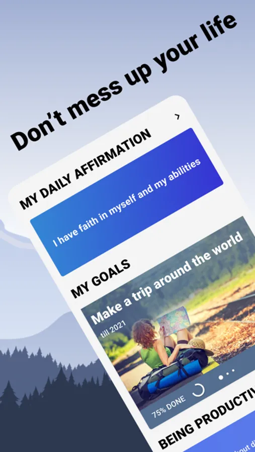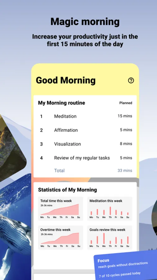 - Build your perfect morning: meditation, affirmations, an overview of your goals and daily tasks. You can add exercises, taking vitamins and reading a book.