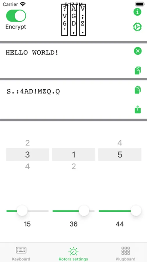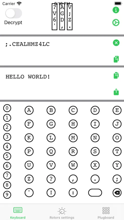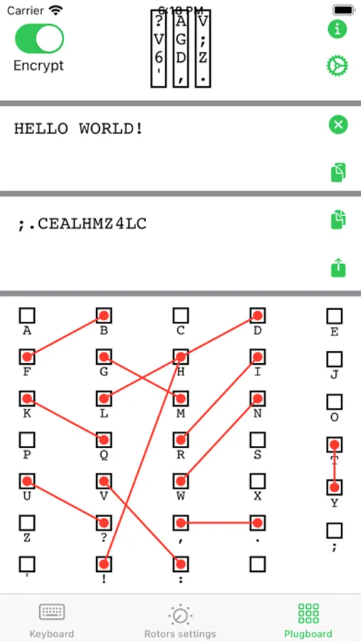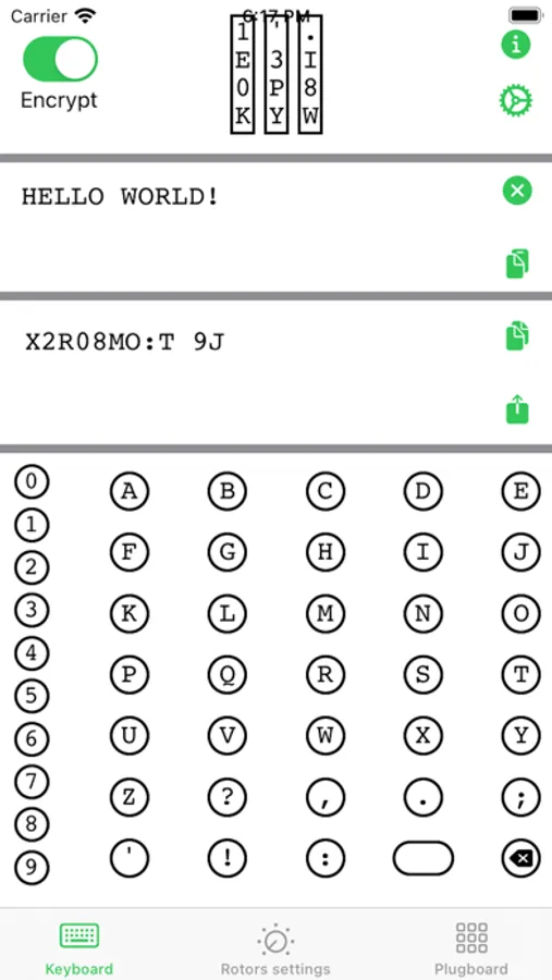 This app has all the features of the original machine and more : share the settings of your machine easily as well as encrypted text.