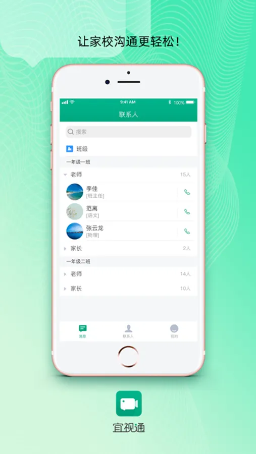 宜视通满足了学校、老师、家长、学生即时沟通分享、随时随地教学的需求,保障家校互动顺畅、高效运行。主要包括消息、联系人、我的等。