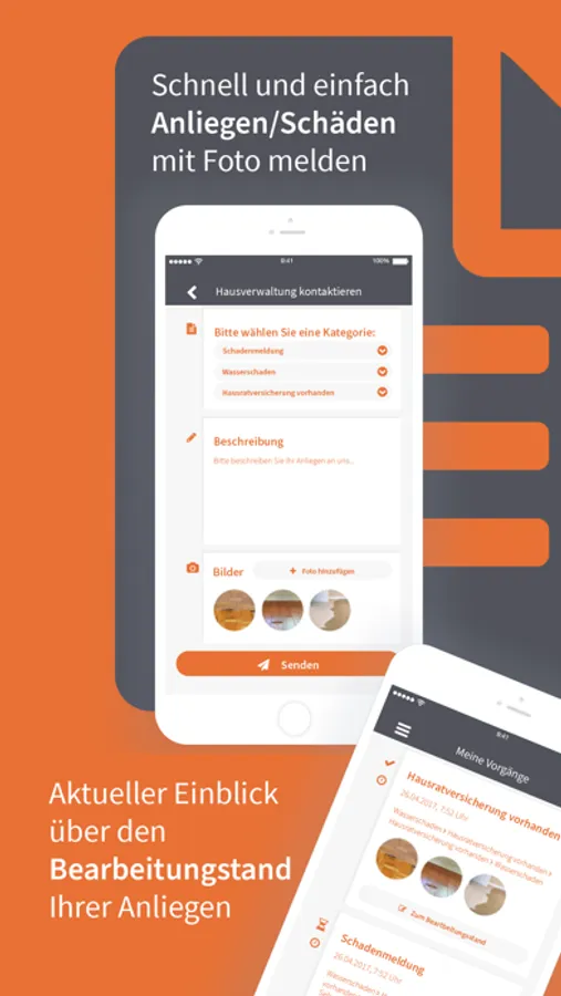 Als Mieter oder Eigentümer können Sie Schäden oder Anliegen direkt mit Fotos über unsere App melden. Ihre Anfragen stehen unseren Mitarbeiten dann zur Verfügung und können auch an Handwerksbetriebe weitergeleitet werden.