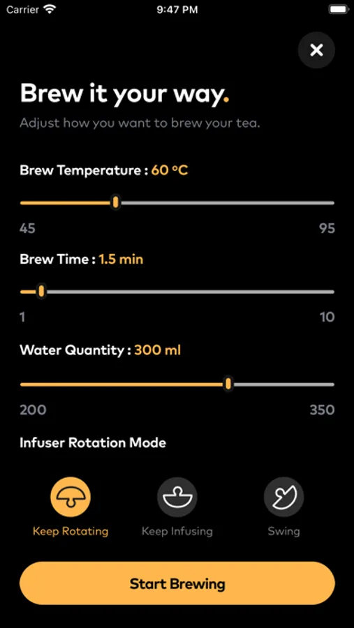 • Adjust brewing using our tea master brewing page. Here you will be able to change the time, temperature of brewing. You will also be able to modify the infuser rotation and speed to change the brew as you desire.