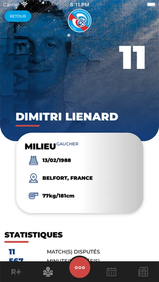 • Effectif pro en détail (statistiques de la saison, parcours, photos, etc.)