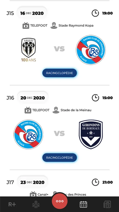 • Accès à la Racingclopédie avec le détail des rencontres passées (conférence de presse, groupe, score, statistiques, direct commenté, classement, résumé, etc.)