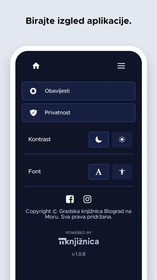 Aplikacija je namijenjena korisnicima Gradske knjižnice Biograd na Moru i omogućuje pretraživanje e kataloga Knjižnice, provjeru dostupnosti knjiga, produženje i rezervaciju knjiga, praćenje kalendara događanja i obavijesti. Unutar aplikacije nalaze se sve potrebne informacije o Knjižnici i njezinim uslugama (radno vrijeme, česta pitanja, kontakt, poveznice na društvene mreže).