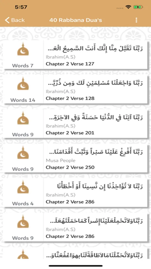 This application is a collection of 40 Duas (invocations) of the Qur'an that begin with the word "Rabbana" (Our Lord). Each Rabbana is displayed in Arabic with its meaning , transliteration and audio.