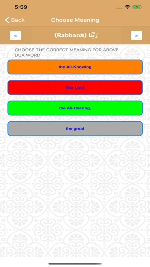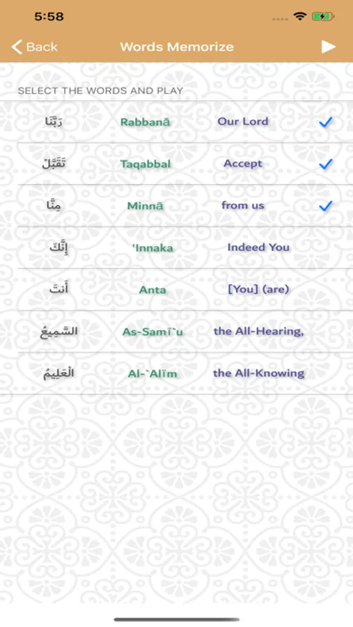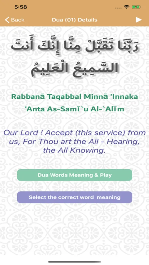 This app tries to indulge people in understanding, appreciating and learning word by word meanings of these Quranic duas, and also analyses if the person using this app has indeed learned the words or needs more practice.