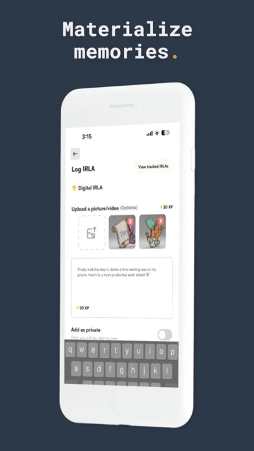 From the "mundanity masterclass" of washing dishes, to the "Herculean hustle" of running a marathon, IRLA serves you XP on a silver platter for every task you tackle. But hold up, we're not just a mundane task ticker! We're a scrapbook for your life achievements. Snap a pic, shoot a video, jot down your thoughts - and viola! Your in-game victory is now an out-of-game trophy, ready to reminisce at a swipe.