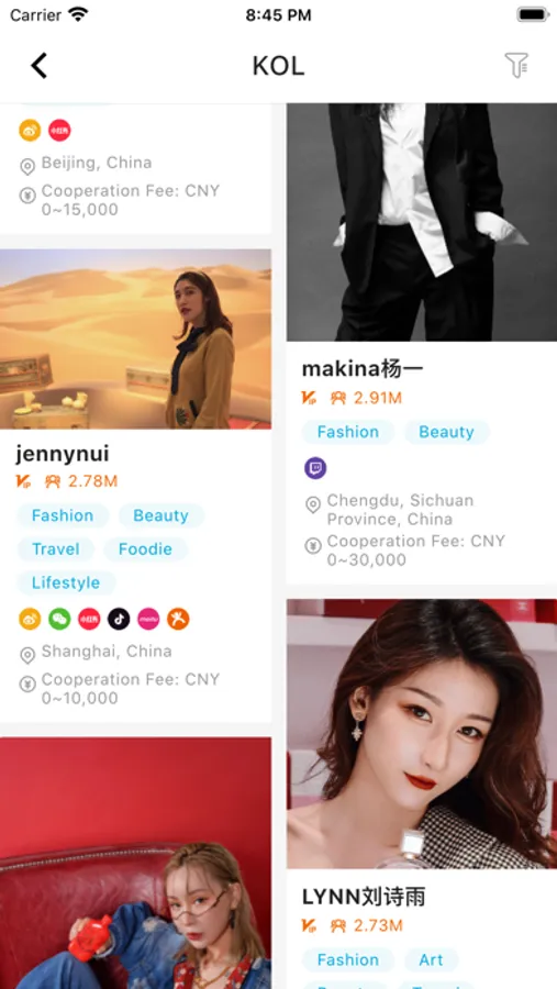 GOKOLS is pioneering in providing brands and influencers with an integrated self-service solution. Based on different conditions such as regions, industries, labels, social media platforms, etc., both brand and influencer can search, screen and work with each other freely via below key functions: