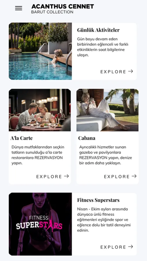 Acanthus Cennet mobil uygulamamız üzerinden bir çok hizmete kolayca erişebilir, konaklamanızın daha eğlenceli ve konforlu geçmesini sağlayabilirsiniz. Günlük aktivitelerden, otel restoranlarının menülerine kadar bir çok bilgiye kolaylıkla ulaşabilirsiniz.