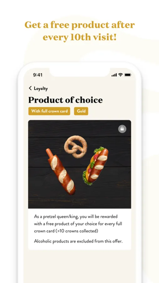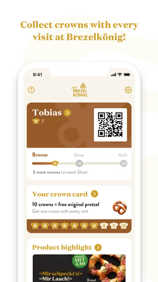 With "My Brezelkönig" you collect crowns with every visit at Brezelkönig (1 visit = 1 crown). You benefit from attractive rewards in the app. The higher your status, the more attractive your benefits.