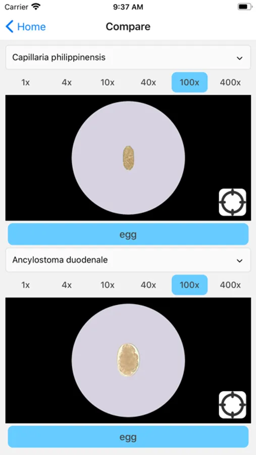 This app aims to bring more intuition to learning to recognize the sizes and features of common gastrointestinal parasites while actual samples and physical microscopes are not available, and perhaps provide some basic knowledge along the way.