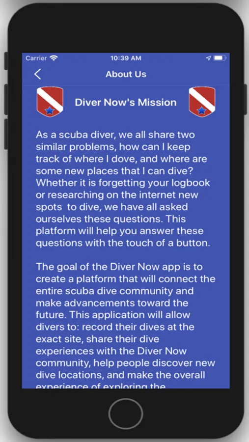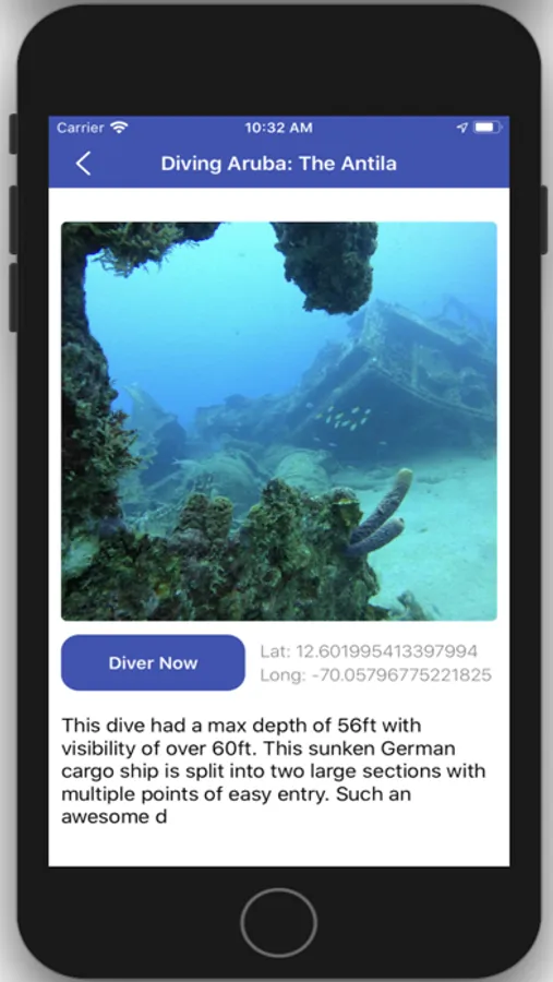 The goal of the Diver Now app is to create a platform that will connect the entire scuba dive community and make advancements toward the future. This application will allow divers to: record their dives at the exact site, share their dive experiences with the Diver Now community, help people discover new dive locations, and make the overall experience of exploring the underwater world effortless and enjoyable.