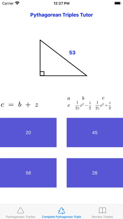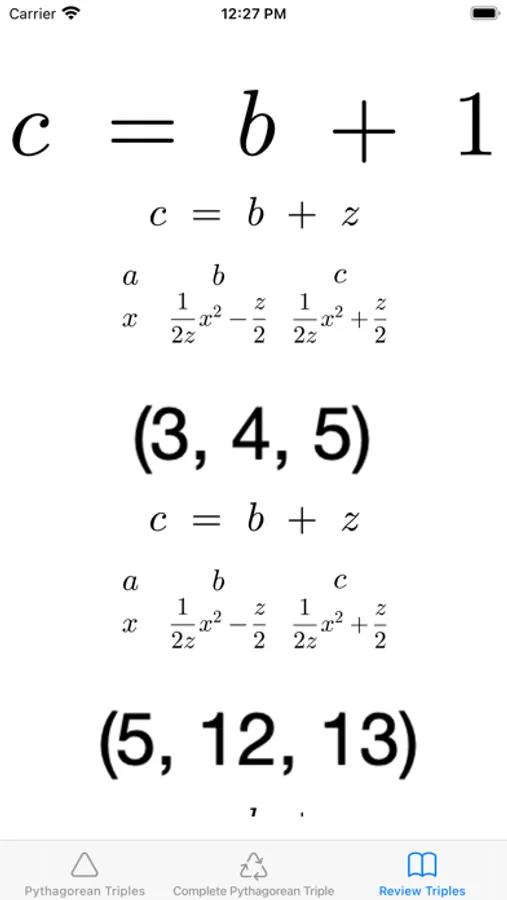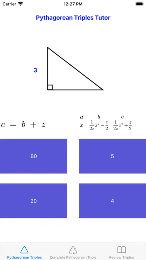 Pythagorean triples are a set of positive integers a, b, and c that fit the Pythagorean Theorem formula. By memorizing the basic set of Pythagorean triples you will be able to recognize and solve quickly numerous different math problems in geometry, pre-algebra, algebra, pre-calculus & calculus; simply by recognizing that one or or two of the legs of the triangle correspond to a Pythagorean Triple triangle.