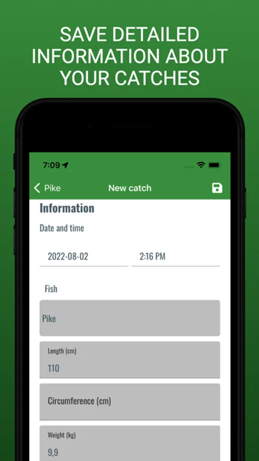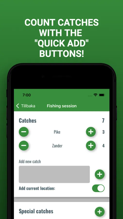 With the "fishing session" feature you can easily count the number of catches, add photos or register special catches if you catch a fish you want to save more information about.