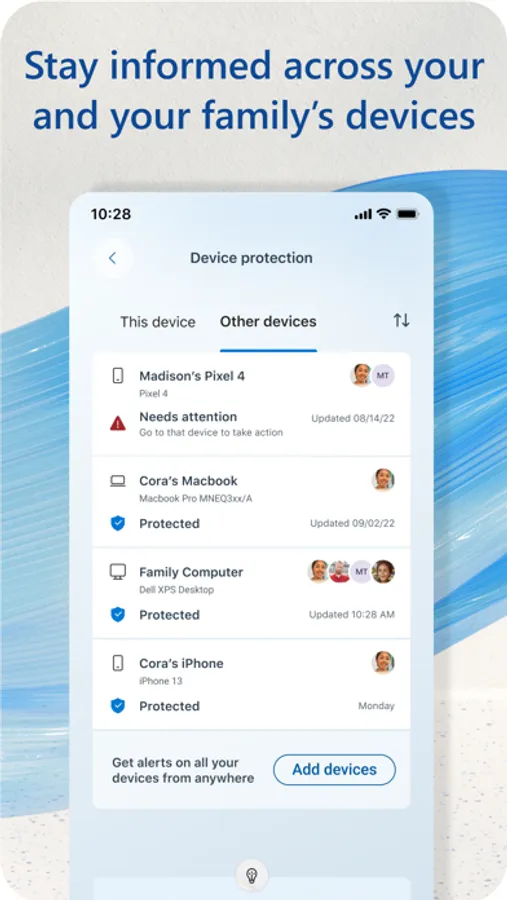 Seamlessly protect your data and devices with Microsoft Defender.(1) You and your family can easily manage your online security in one app with notifications, expert recommendations, and security tips designed to help you stay safer online. Microsoft Defender for individuals requires a Microsoft 365 Personal or Family subscription.