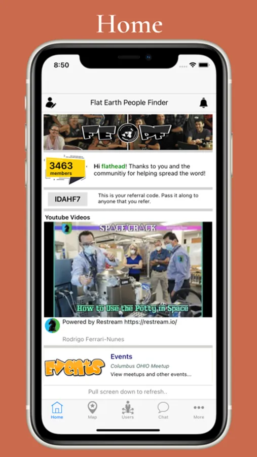 Direct message other Flat Earth users by clicking a marker on the map. Create and participate in the forum discussion. Upload images from your device. Real-time chat. Upload youtube video links. Create and view Flat Earth events. Our goal is to increase the ability of our community to collaborate with each other.