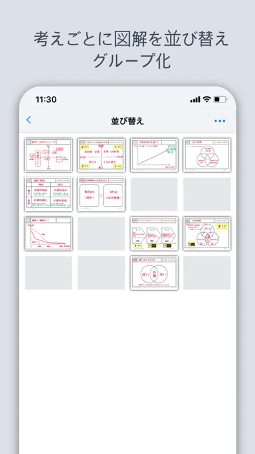 * テーブルやホワイトボードでふせんを並び替えるがごとく、自由に図解やイメージデータをグループ化。図解出来るだけでなく、机の上に並べる感覚でドラッグ&ドロップ。ギャラリー保存やシェアも簡単。
