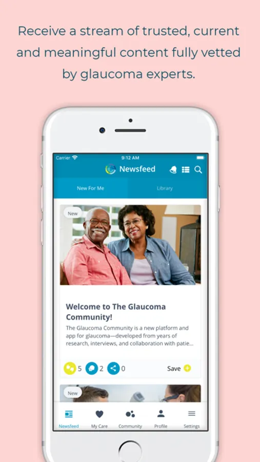 • With The Glaucoma Community app, you’ll receive a continuous stream of updated, Glaucoma-related article summaries on every important topic, including research, treatments, and living tips - all reviewed and vetted by our Content Advisory Council members at Prevent Blindness.