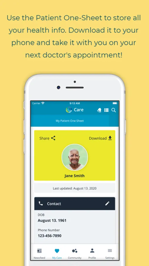 • Keep everything in one place with our Patient One-Sheet, a secure, printable, and shareable form that allows you to easily store and maintain all your basic information – doctors, insurance info, medications, and other key data.