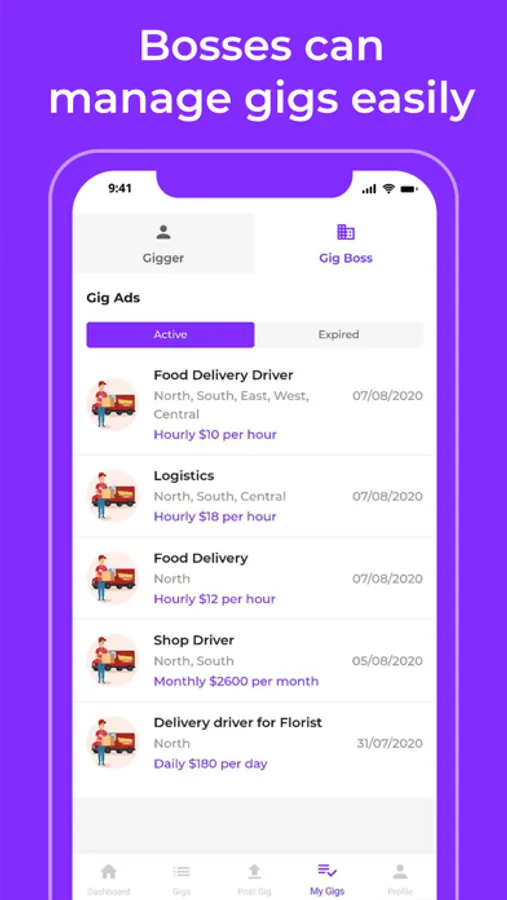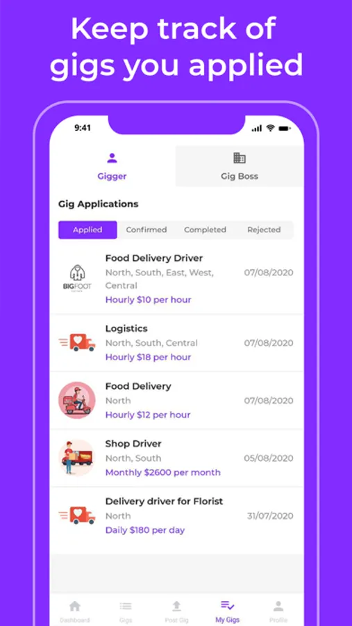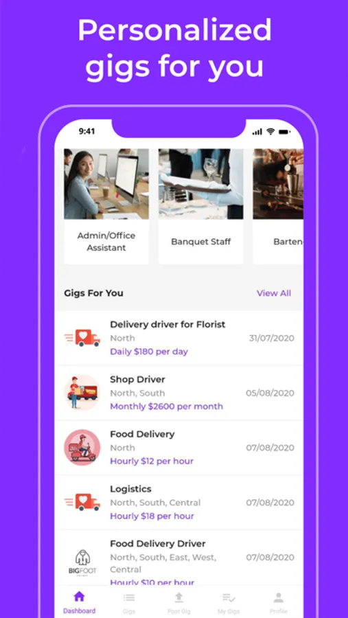 - Receive instant push notifications of gigs that match your criteria and from your favourite bosses.