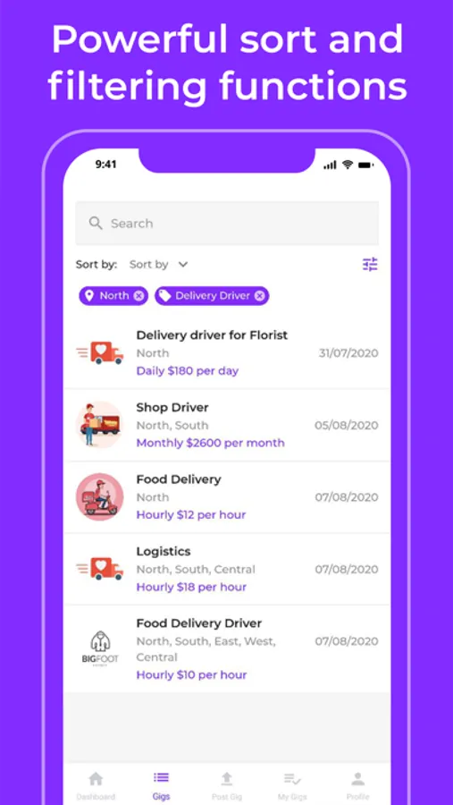 - Search by gig category, dates, location or bosses you follow. Advanced filtering options to help you find the perfect gig.
